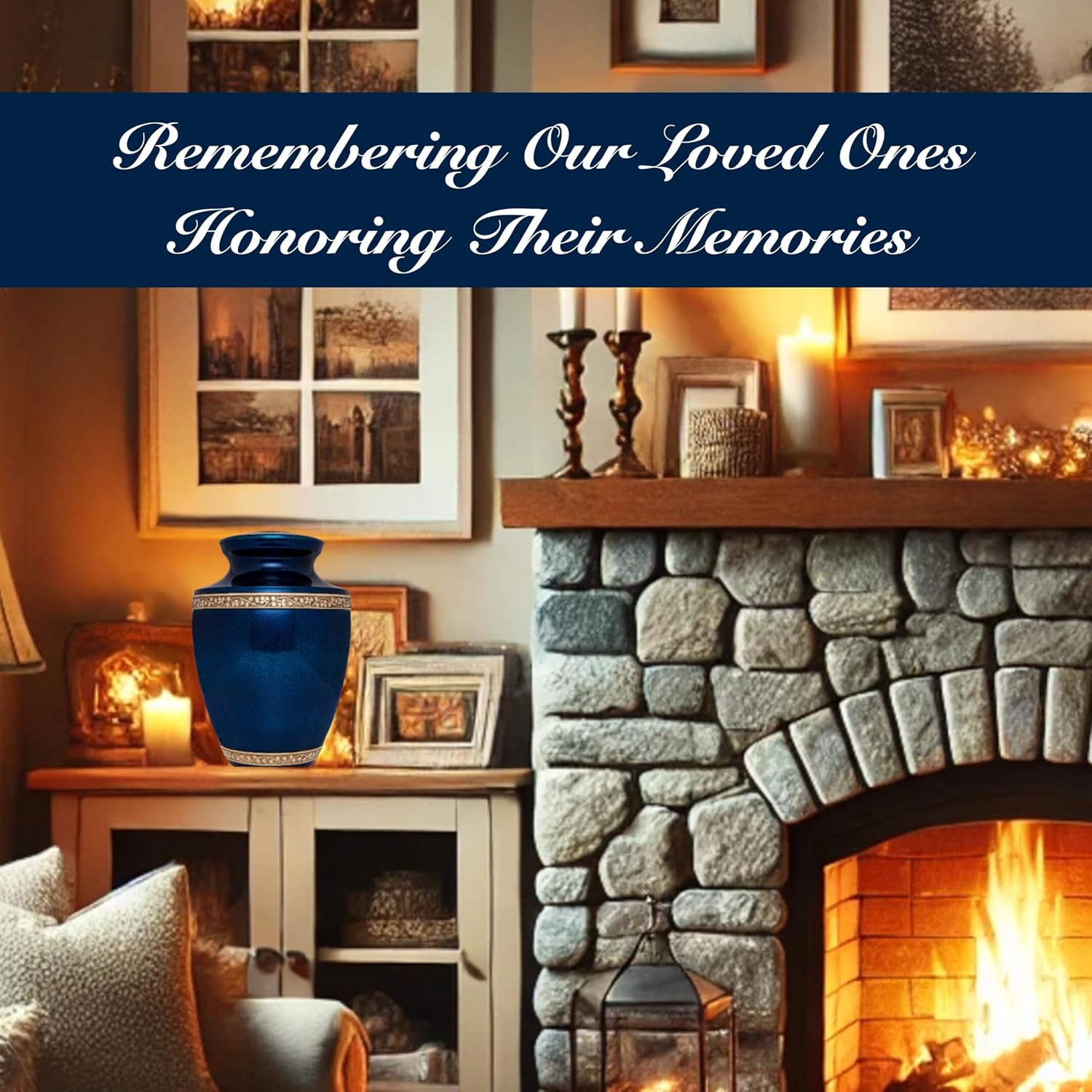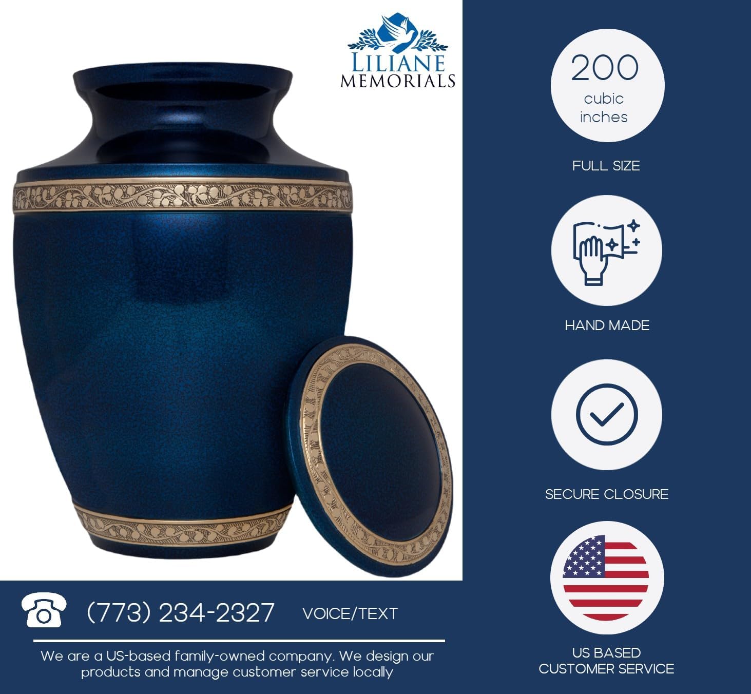 - ► EXPERTLY HANDCRAFTED ◄ Each cremation urn is beautifully unique: This design features two hand ENGRAVED gold bands on a beautifully hand-painted azure blue background. Finished in a clear protective coat for durability and BRILLIANCE, this navy blue urn is a PERFECT MEMORIAL for a special loved one.