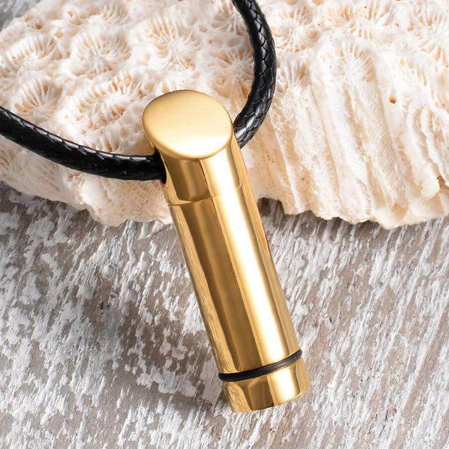 This Gold Stainless Steel Cremation Urns Necklace combines durable craftsmanship with thoughtful design. Made from high-quality stainless steel with a gold finish, it offers longevity without tarnishing. The cylindrical pendant securely holds a small portion of ashes or keepsakes, serving as a meaningful memorial you can wear close to your heart. Its versatile design matches various styles, making it suitable for everyday wear or special occasions. Crafted for both fashion and sentiment, this necklace allows you to honor your loved ones while maintaining a polished, refined appearance.