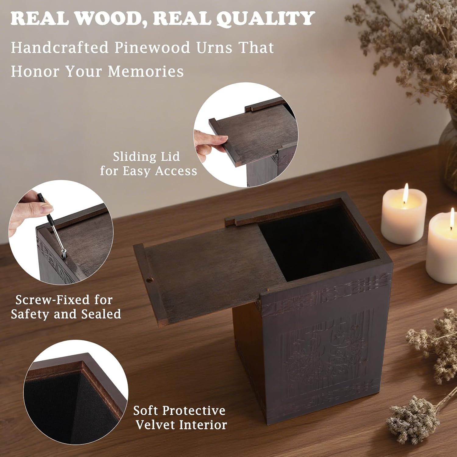 - EXTRA PROTECTION FOR YOUR LOVED ONE: This urn box features a secure screw-on lid and a soft cotton-linen interior bag to safely hold the ashes. Its sliding bottom opening provides additional security, ensuring that your loved one’s remains stay safe. For safe unboxing, please handle carefully to avoid scratching or damaging the funeral urns