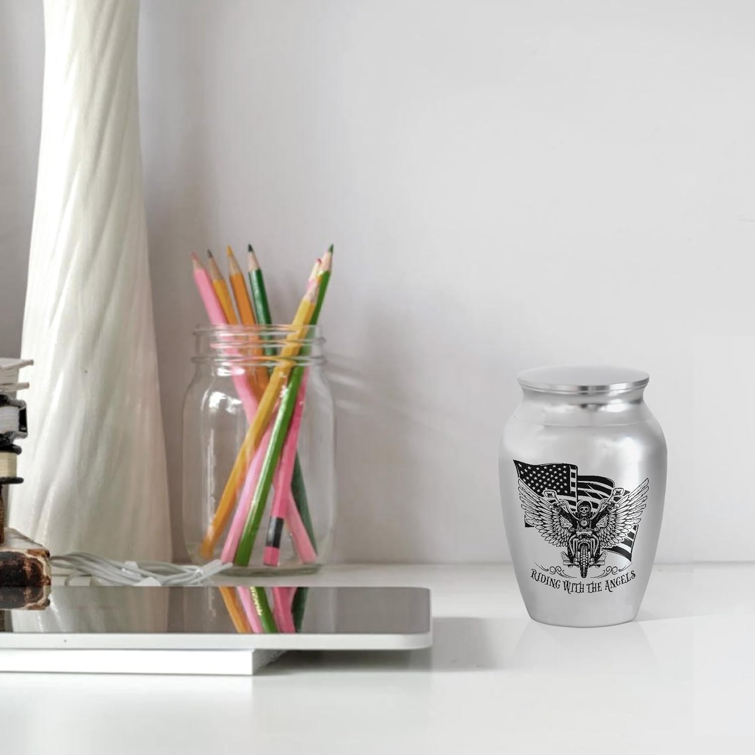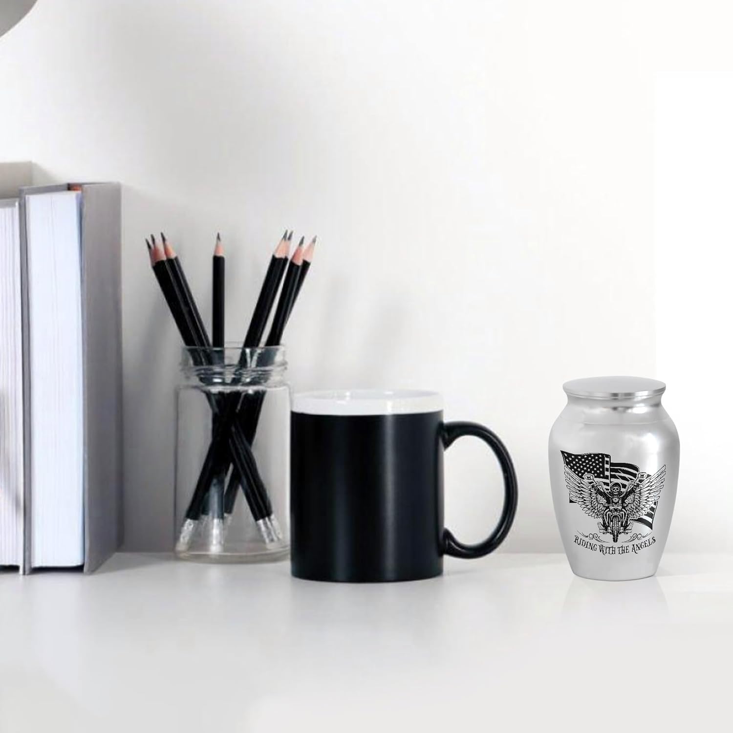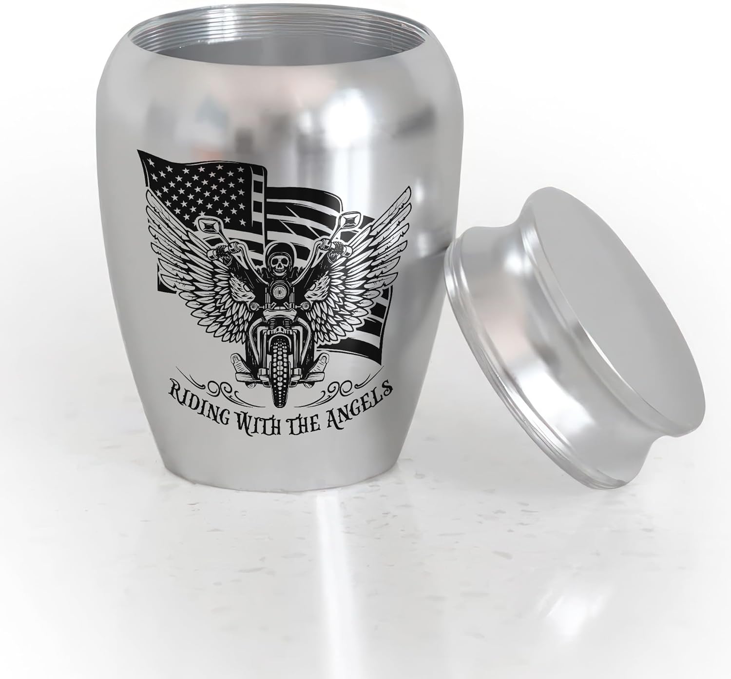 - DESIGN: The "Riding with the Angels" inscription on the urn adds a poignant and touching element to the memorial, reminding you that the spirit of the rider lives on, free and fulfilled. This heartfelt message serves as a comforting reminder that your loved one's passion for the open road and the thrill of the ride continues, even in their passing.