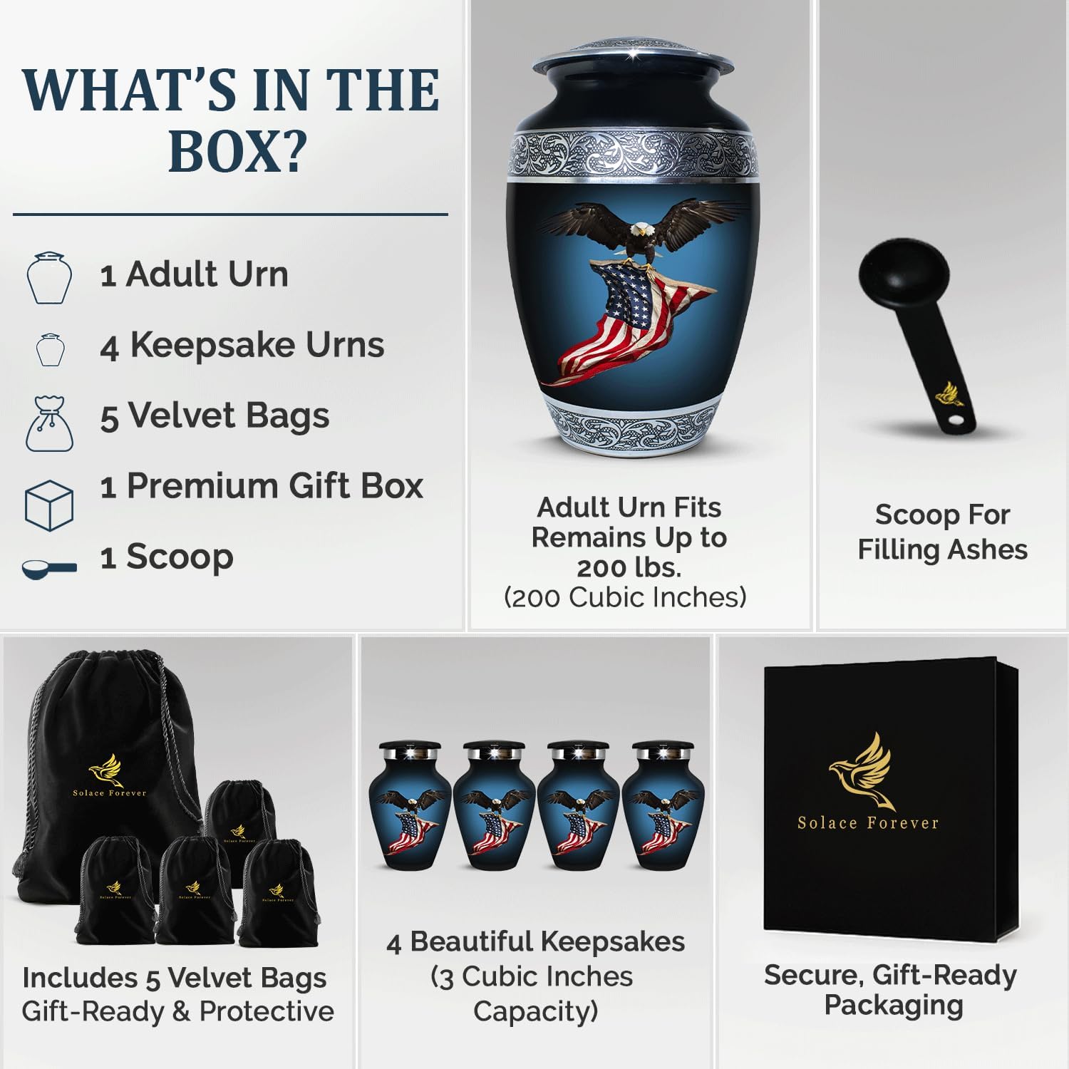 - Honoring your hero with style: This stunning black eagle urn for ashes adult male set includes 1 full-size adult urn (holds 200 cubic inches) and 4 keepsake urns (each holds 3 cubic inches) - perfect for sharing your loved one’s ashes among family or keeping a little close by at home.