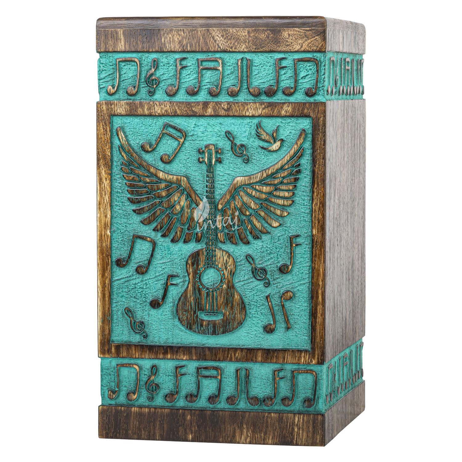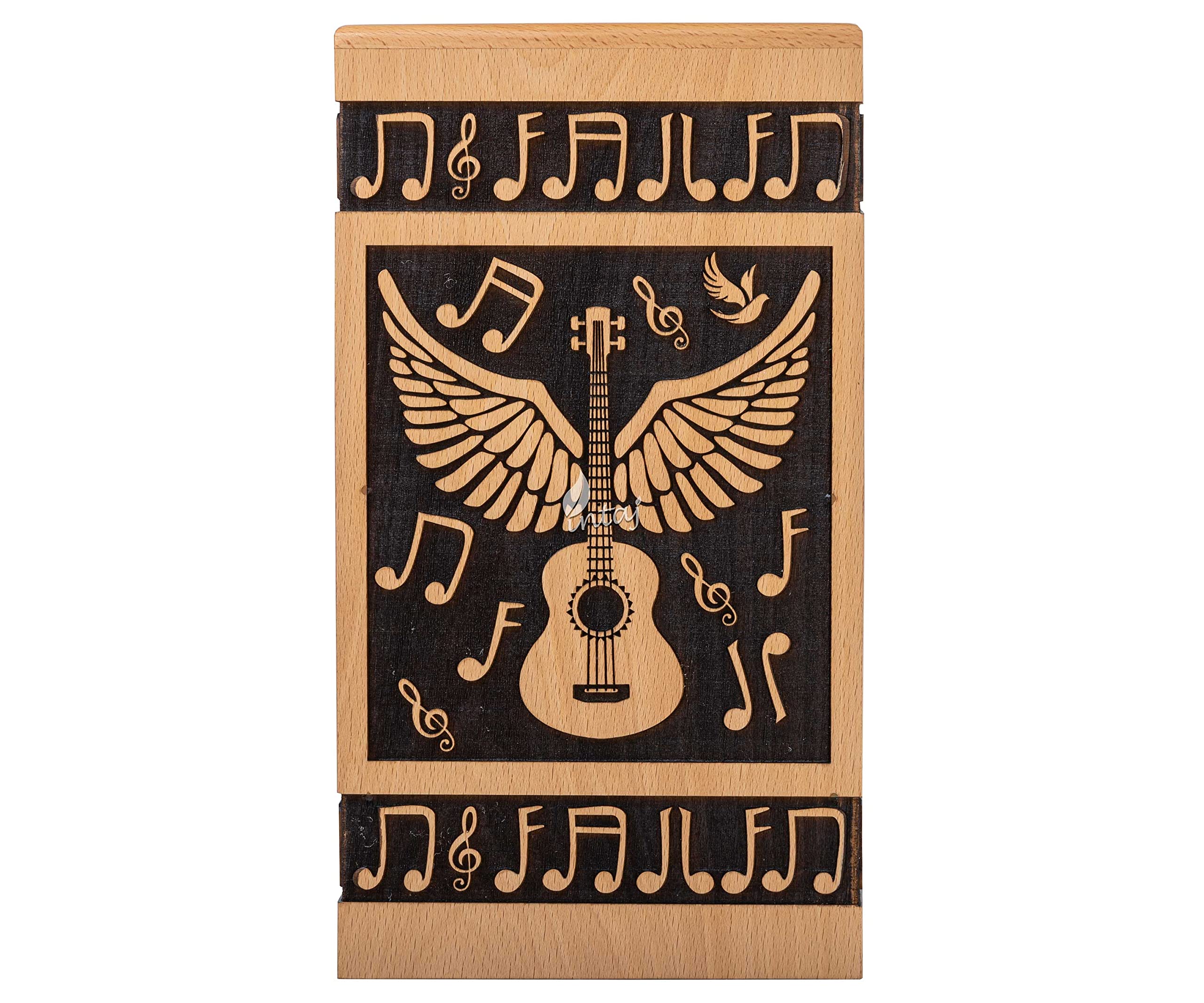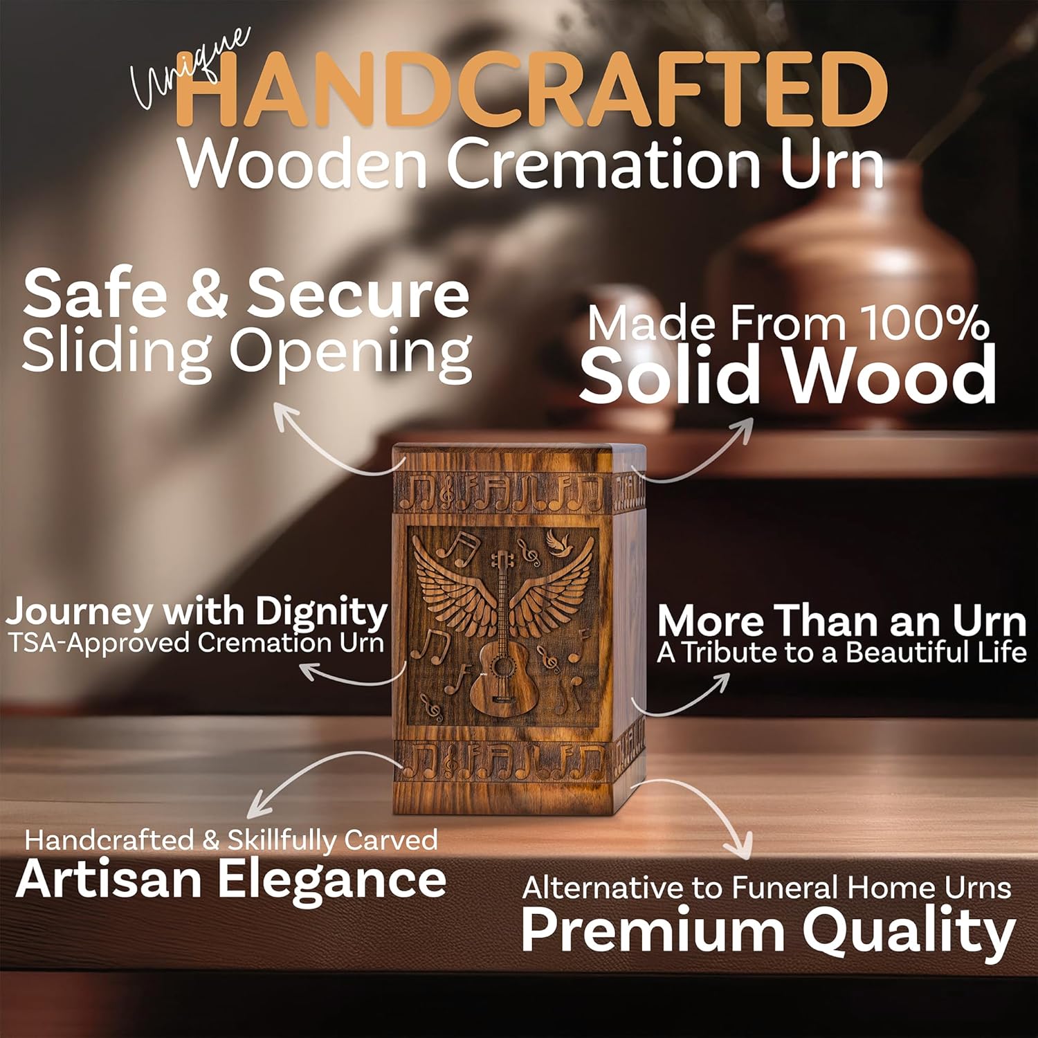 - INTRICATE ANGEL WINGS AND GUITAR DESIGN: This handcrafted rosewood cremation urn features a detailed angel wings and guitar motif, bordered by musical notes and a peaceful dove, symbolizing harmony and serenity. The design serves as a meaningful tribute to your loved one's passion for music and their peaceful rest. This unique design makes it a standout piece among wooden urns for human ashes.