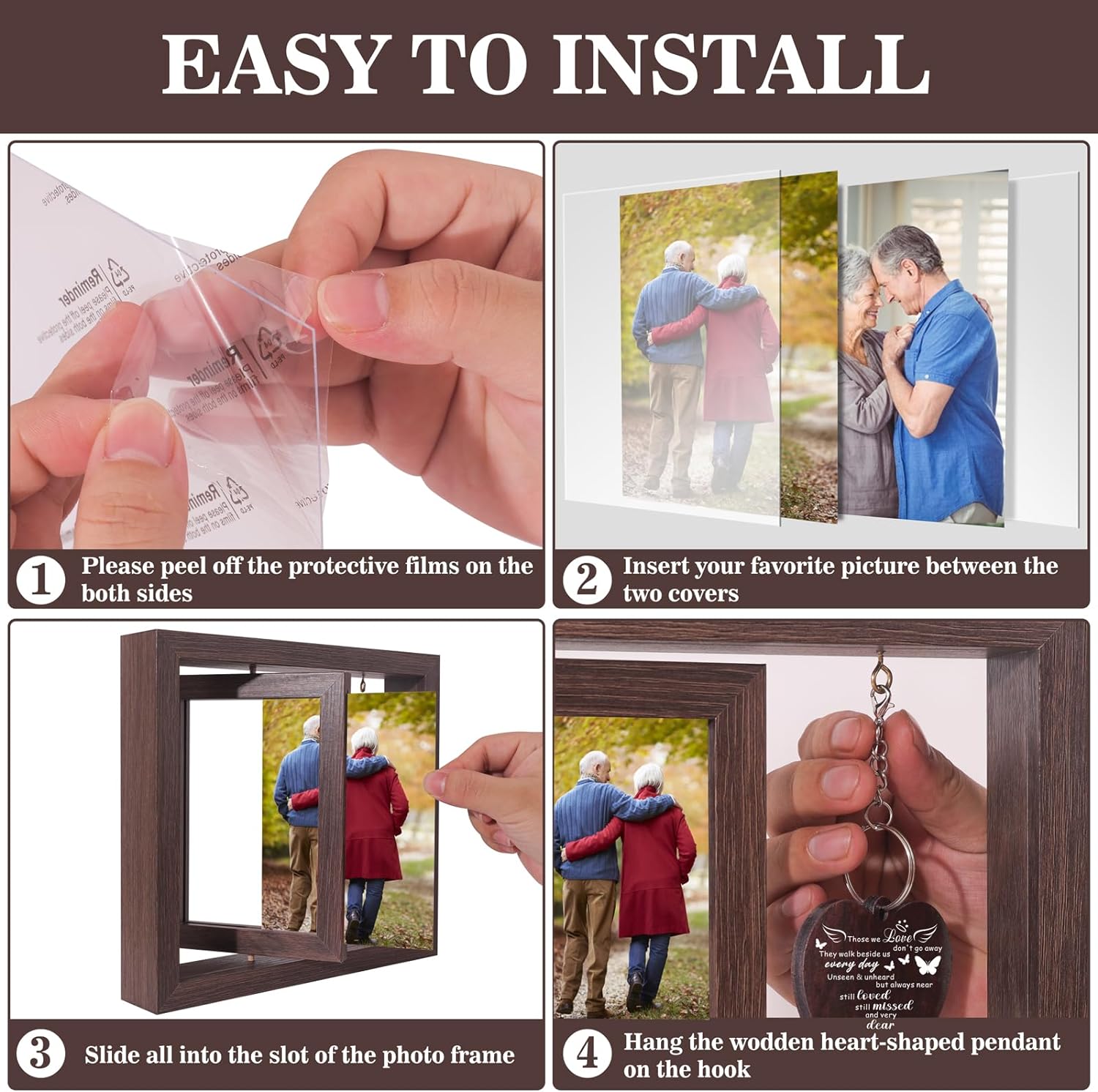 - Loss of Loved One Memorial Gifts: Unlike traditional photo frames, this memorial picture frame boasts a 360 degrees rotation feature, enabling you to showcase two photos simultaneously. With a heart-shaped pendant engraved with touching words "Those we love don't go away, they walk beside us every day. Unseen & unheard, but always near, still loved, still missed, and very dear." While your loved one might be gone, their memory will forever live on.