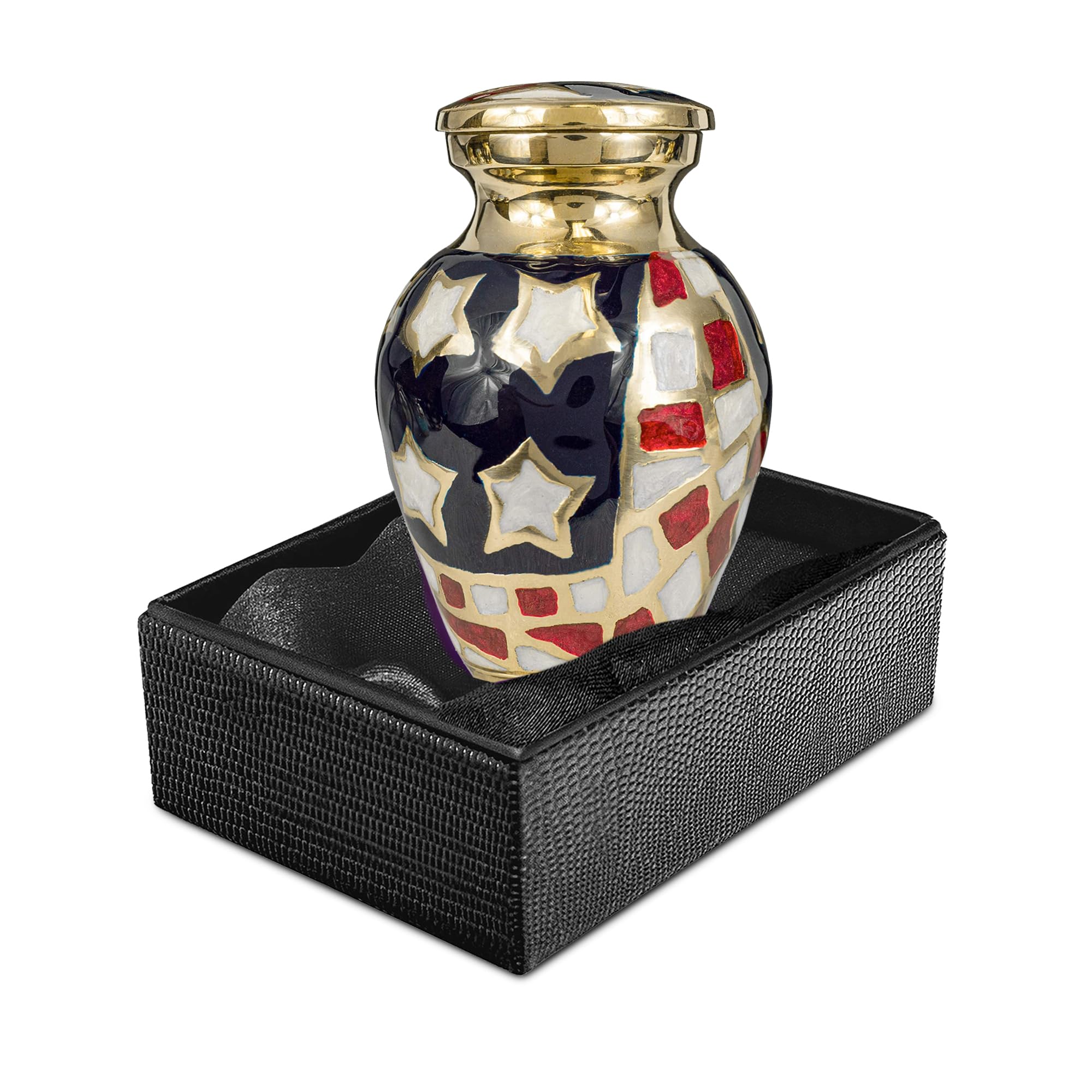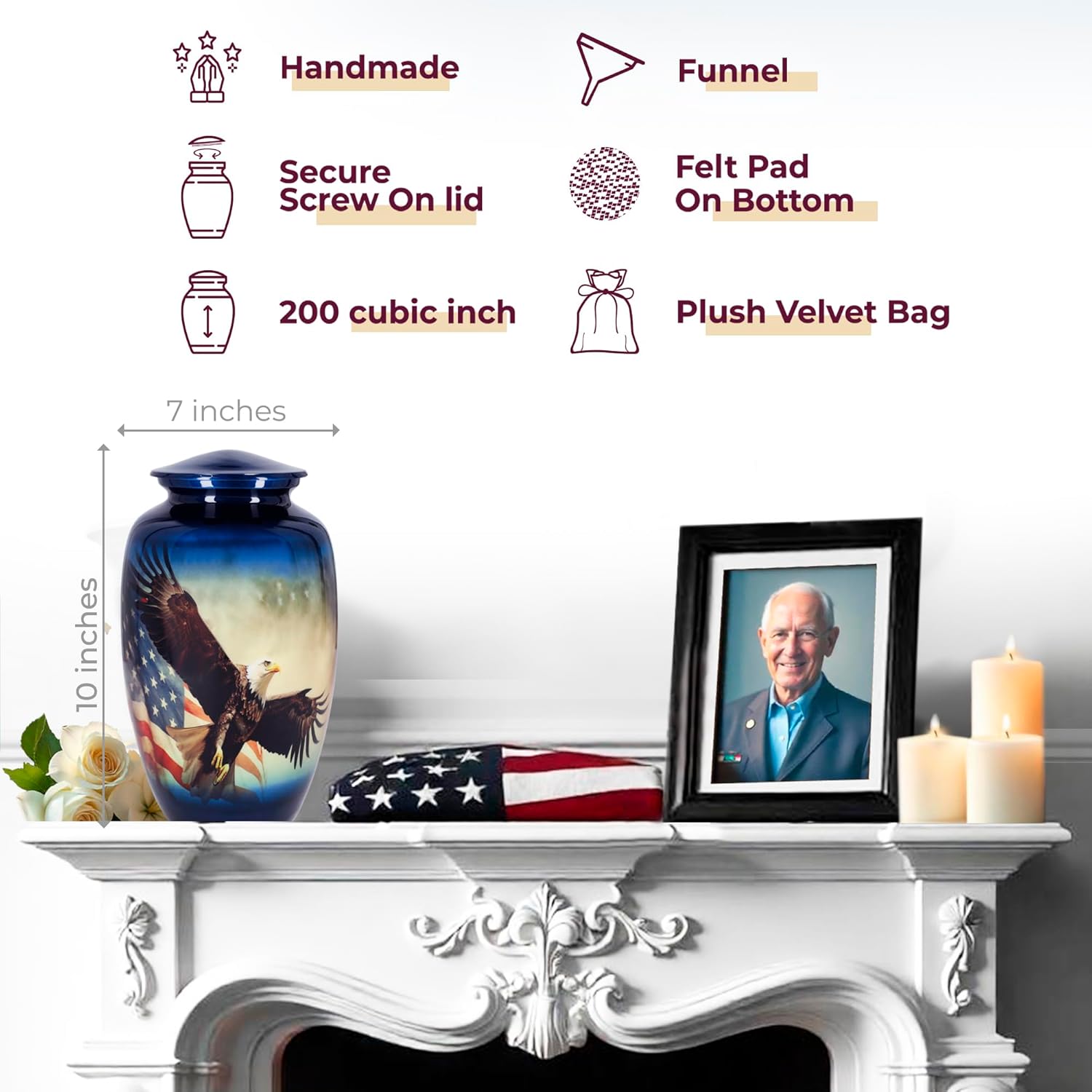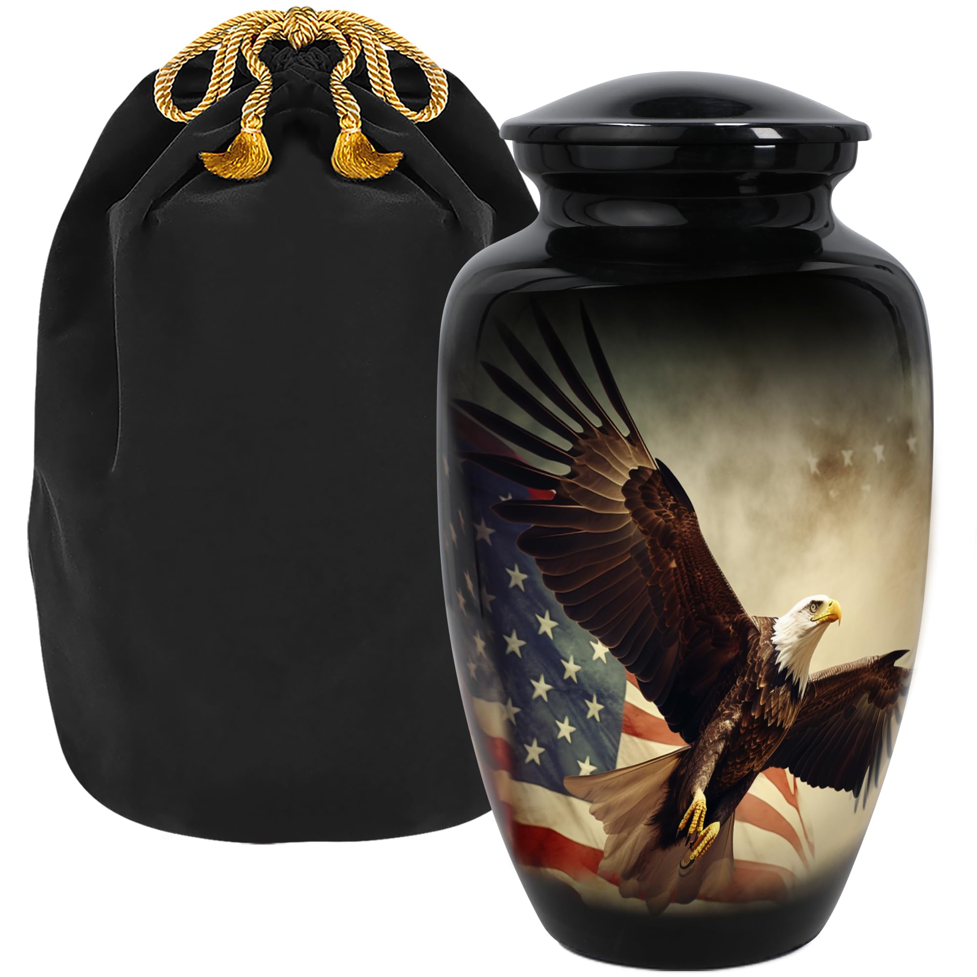 - Elegant Patriotic Cremation Urns for Human Ashes – Crafted from high-grade aluminum, this memorial urn for human ashes adult male showcases a majestic eagle in flight over the American flag, symbolizing strength, freedom, and honor.