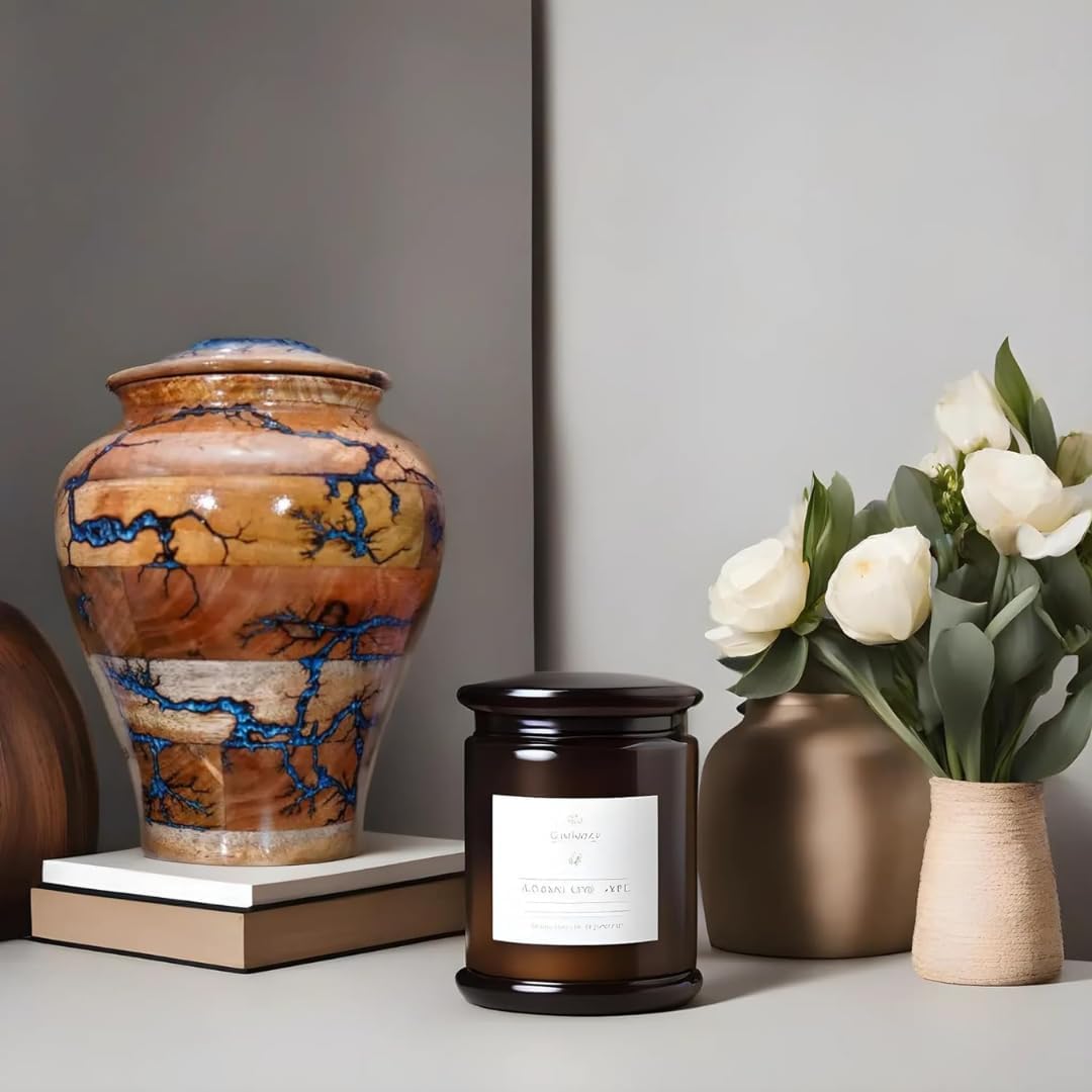 - Our handcrafted urn for human ashes is both sustainable and beautiful. It is made from natural mango wood that has unique knots and grains, along with a striking resin design that highlights the wood's natural fractal patterns. The urn also features a sturdy threaded iron lid that can withstand accidental falls, providing reliable protection for your loved one's ashes. Additionally, a soft felt base on the bottom of the urn protects your furniture from unwanted scratches.