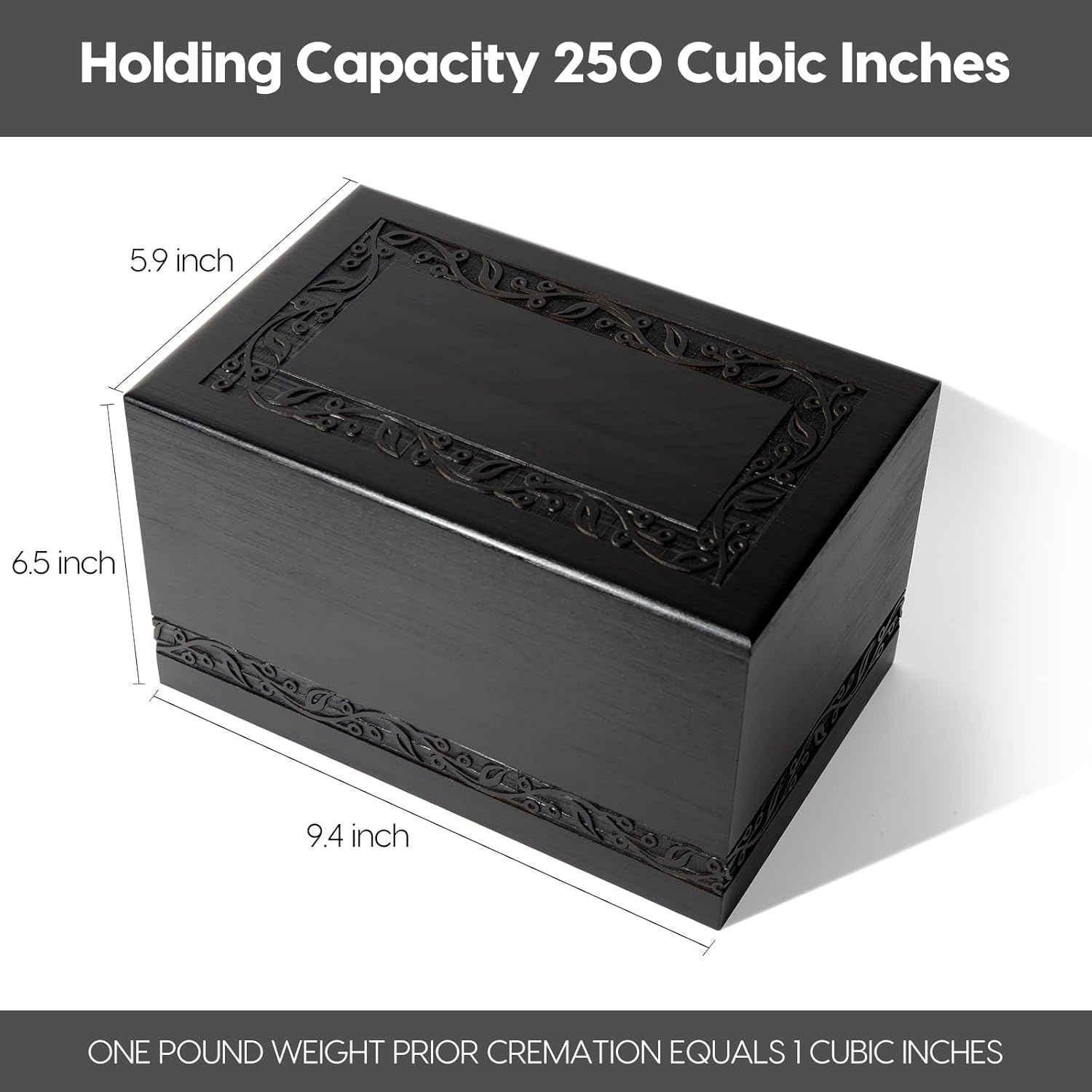 - Outer dimension of our wooden urns for human ashes adult -9.6 x 6.3 x 5.7 Inches | Inner Dimension - 8.8 x 5.5 x 4.9 Inches, Hold up to 250 Cubic Inches of Ashes. NOTE : ONE POUND WEIGHT PRIOR TO CREMATION EQUALS 1 CUBIC INCH
